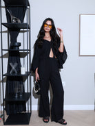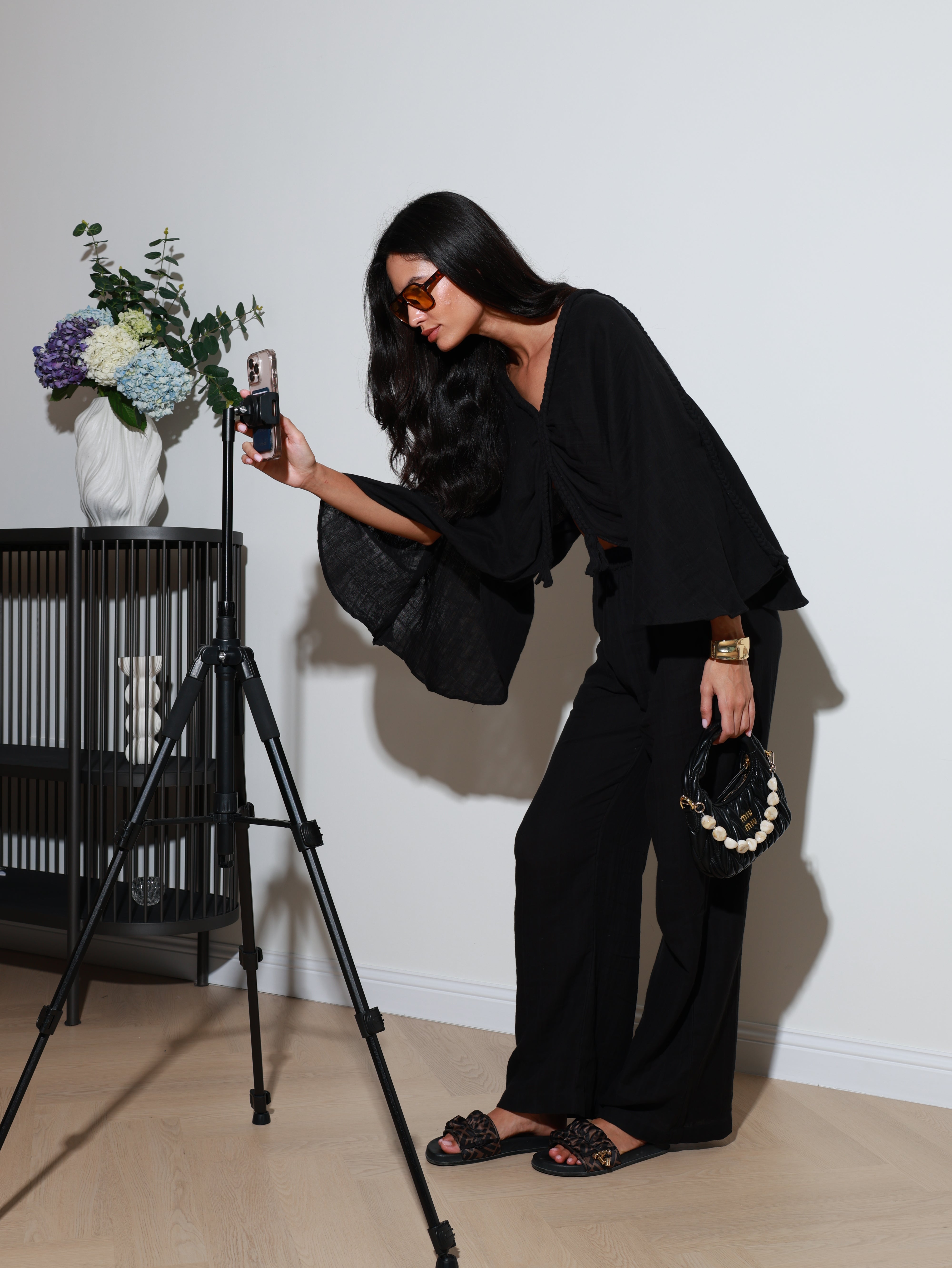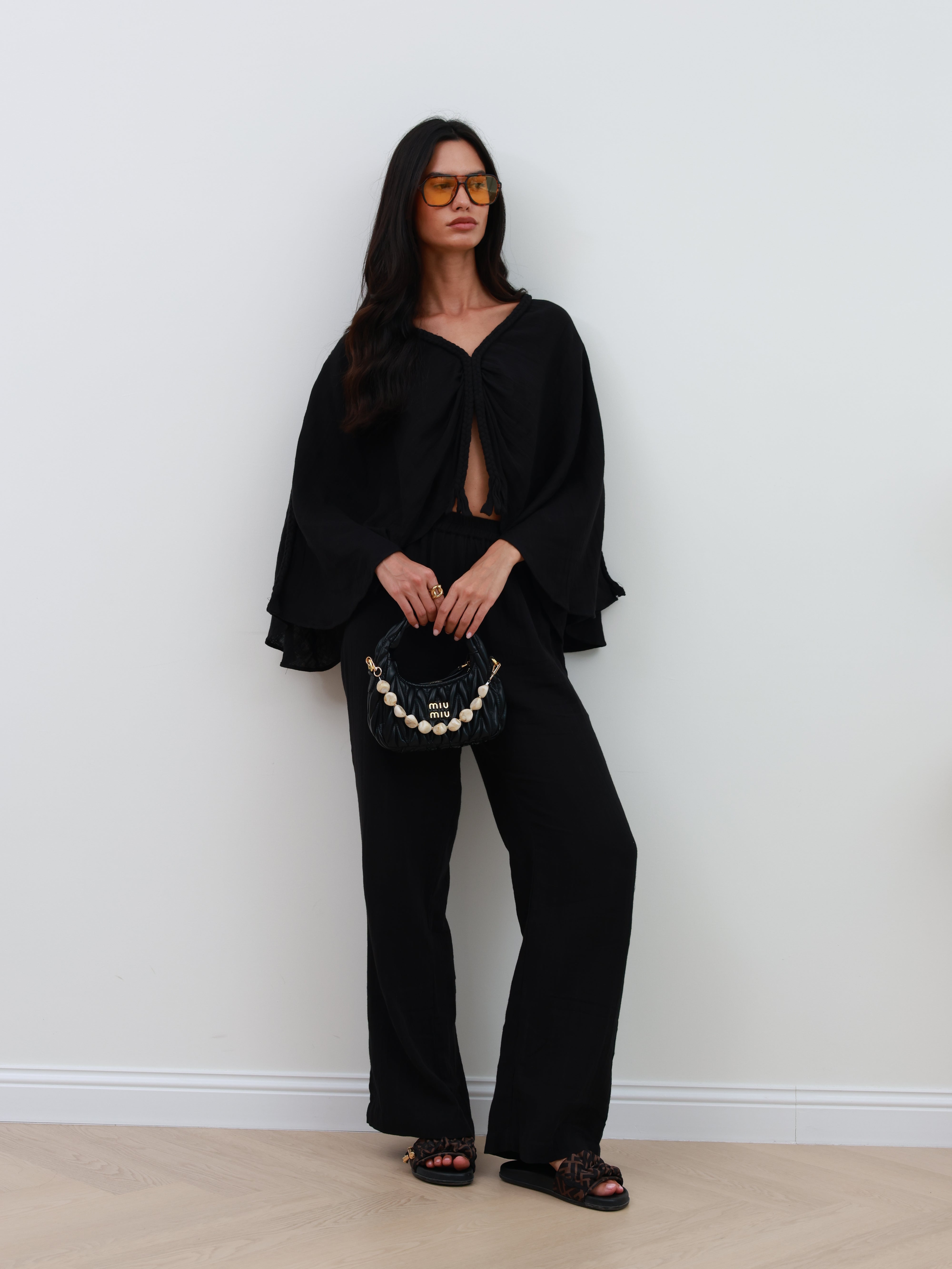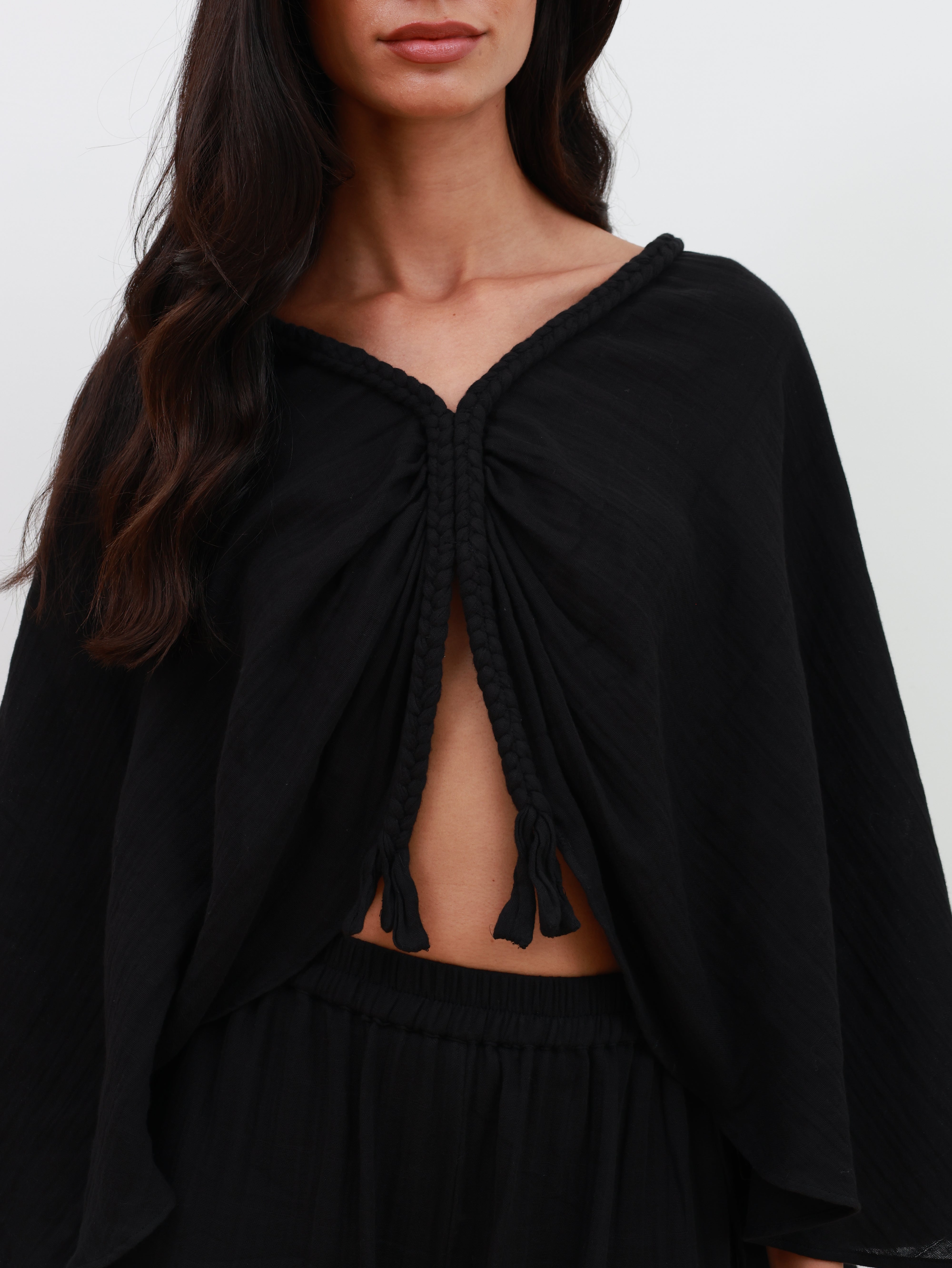 A modern yet minimal co-ord that blends ease with elegance. The cape-style top features a statement braid detail and a deep V-neckline at both front and back, creating a fluid silhouette that feels both effortless and refined. Paired with loose-fit pants designed with side pockets and an elastic waistband, this set offers comfort without compromising on sophistication.