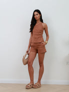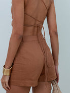 Minimal, modern, and versatile — this co-ord set balances structure with ease. The asymmetrical top features a distinctive cut with cross-criss straps at the back, allowing for a fully customizable fit. Paired with tailored mini shorts detailed with front side pockets, belt loops, and a hook-and-eye/zipper closure, the set offers both function and clean, refined design.