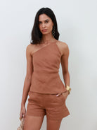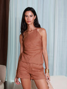 Crafted from 100% linen as the main fabric and fully lined with soft cotton mulmul, the pieces are breathable, lightweight, and gentle on the skin. Designed in a Small (S) fit, the top measures 22” while the shorts measure 15”, creating a balanced silhouette that transitions effortlessly from day to evening.