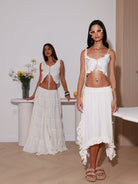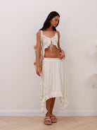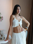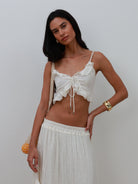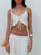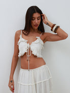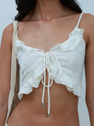 Playful yet refined, this flounce crop top is designed to move effortlessly with you. The adjustable buckles and front drawstring allow for a customizable fit, while the shirred back ensures comfort without losing its shape.
