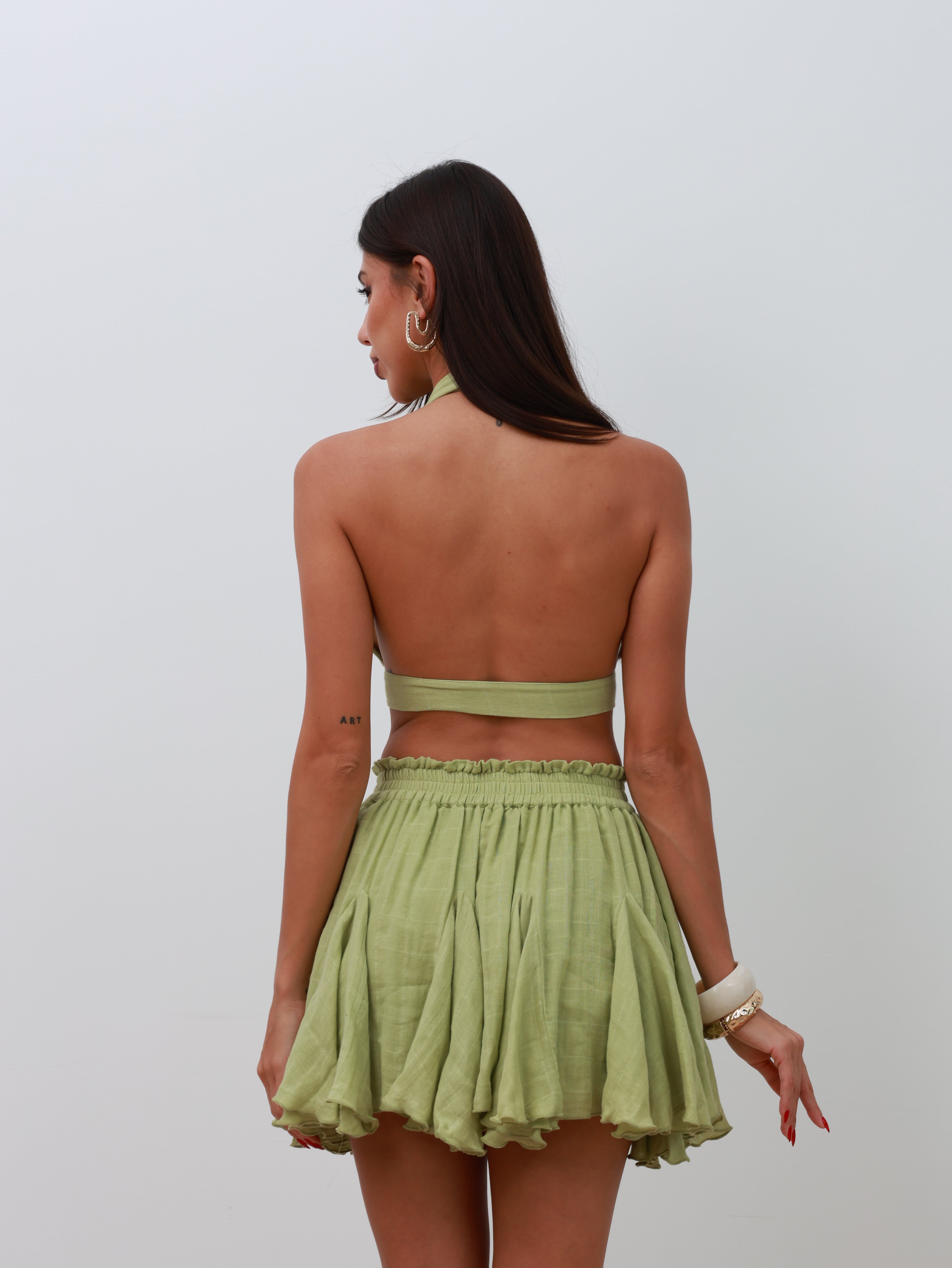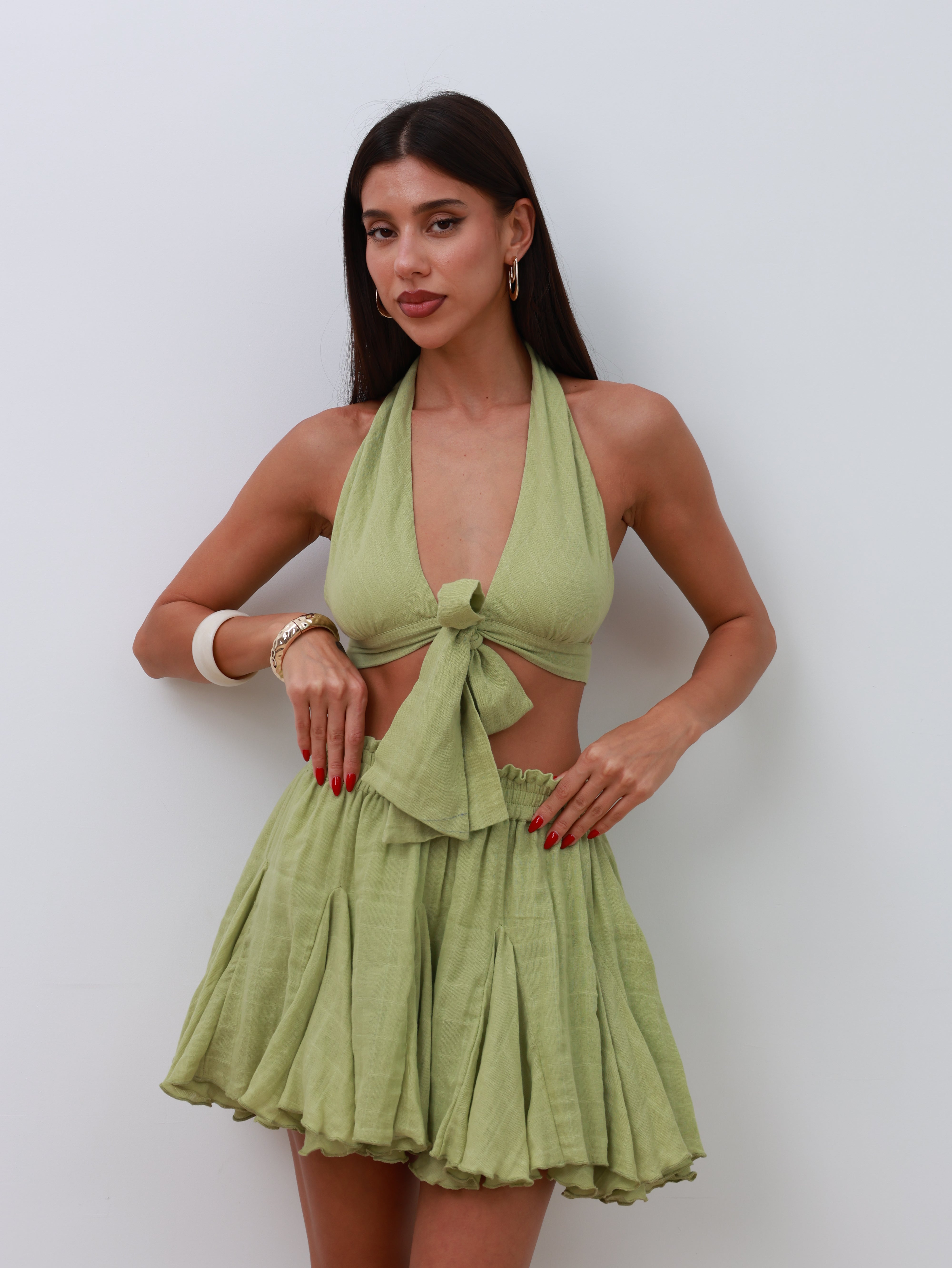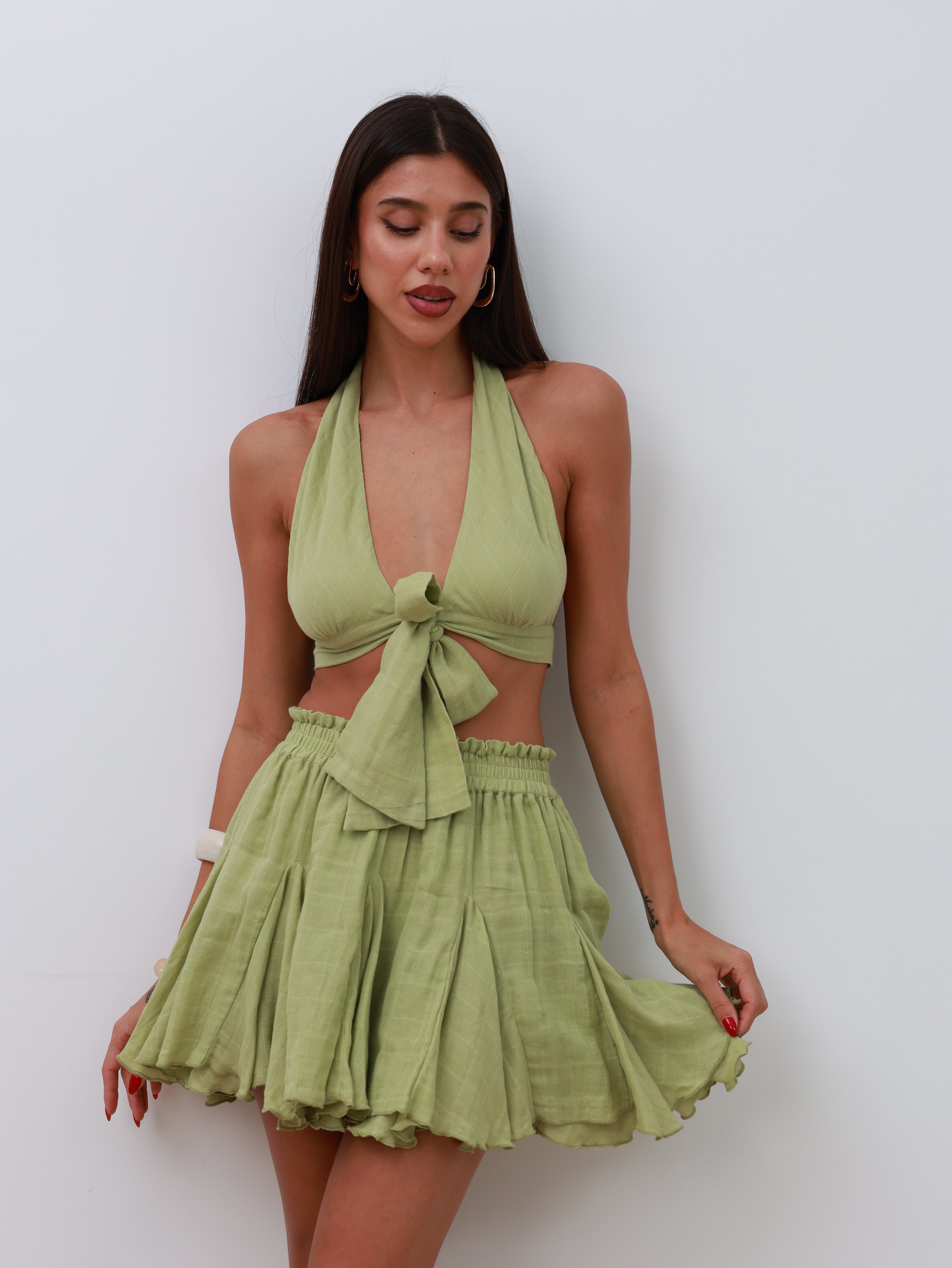 Playful yet refined, this two-piece set pairs a halter backless top with a chic mini gored skirt, creating a silhouette that’s both effortless and elevated. The top features a flattering front tie closure, offering adjustability and charm, while the skirt is designed with an elastic waistband for all-day comfort and ease of wear.