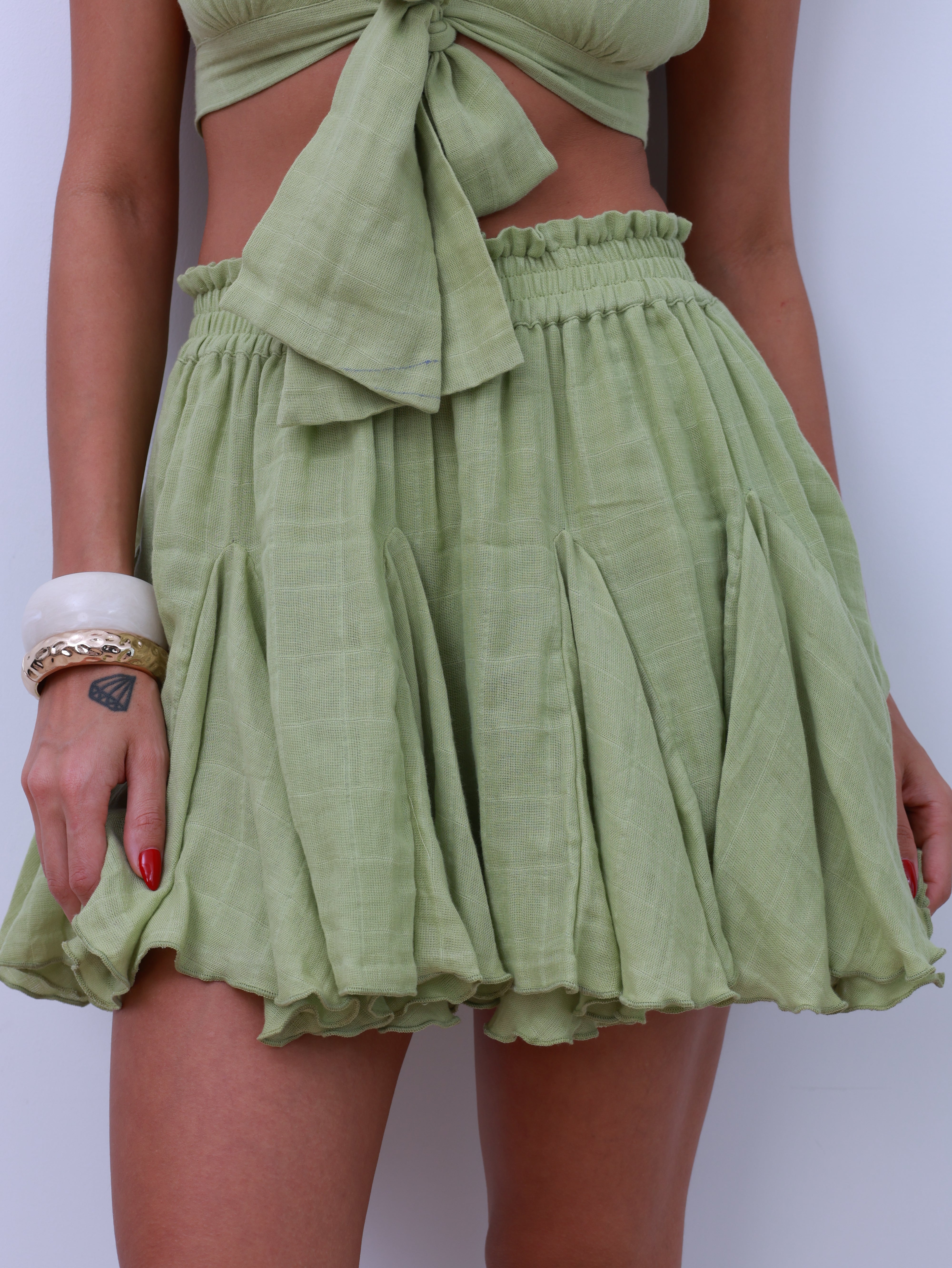 Crafted in plain box gauze as the main fabric and fully lined with soft cotton mulmul, both pieces are lightweight, breathable, and gentle on the skin—ideal for warm days and resort evenings. Cut in a Small (S) fit, the top measures 18” in length and the skirt measures 16”, striking the perfect balance between playful proportions and minimal sophistication.