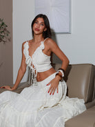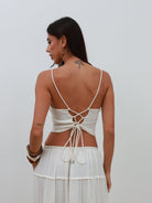 Effortlessly elegant, this sleeveless flounce top blends refined detailing with a modern silhouette. The front is elevated with delicate pin-tuck accents, while the back features loop detailing with a drawstring tie and sleek stopper, adding a touch of understated charm with functional ease.