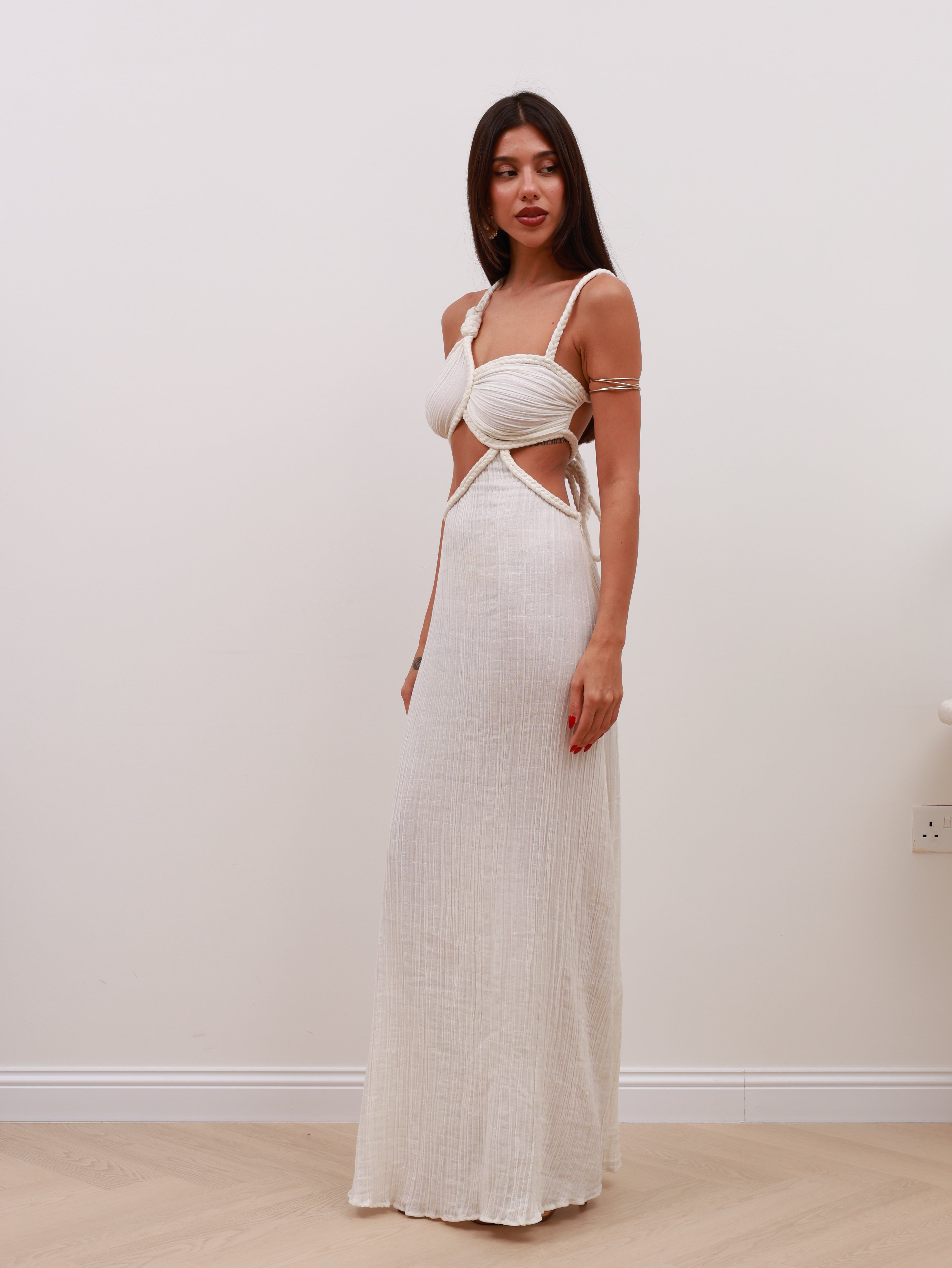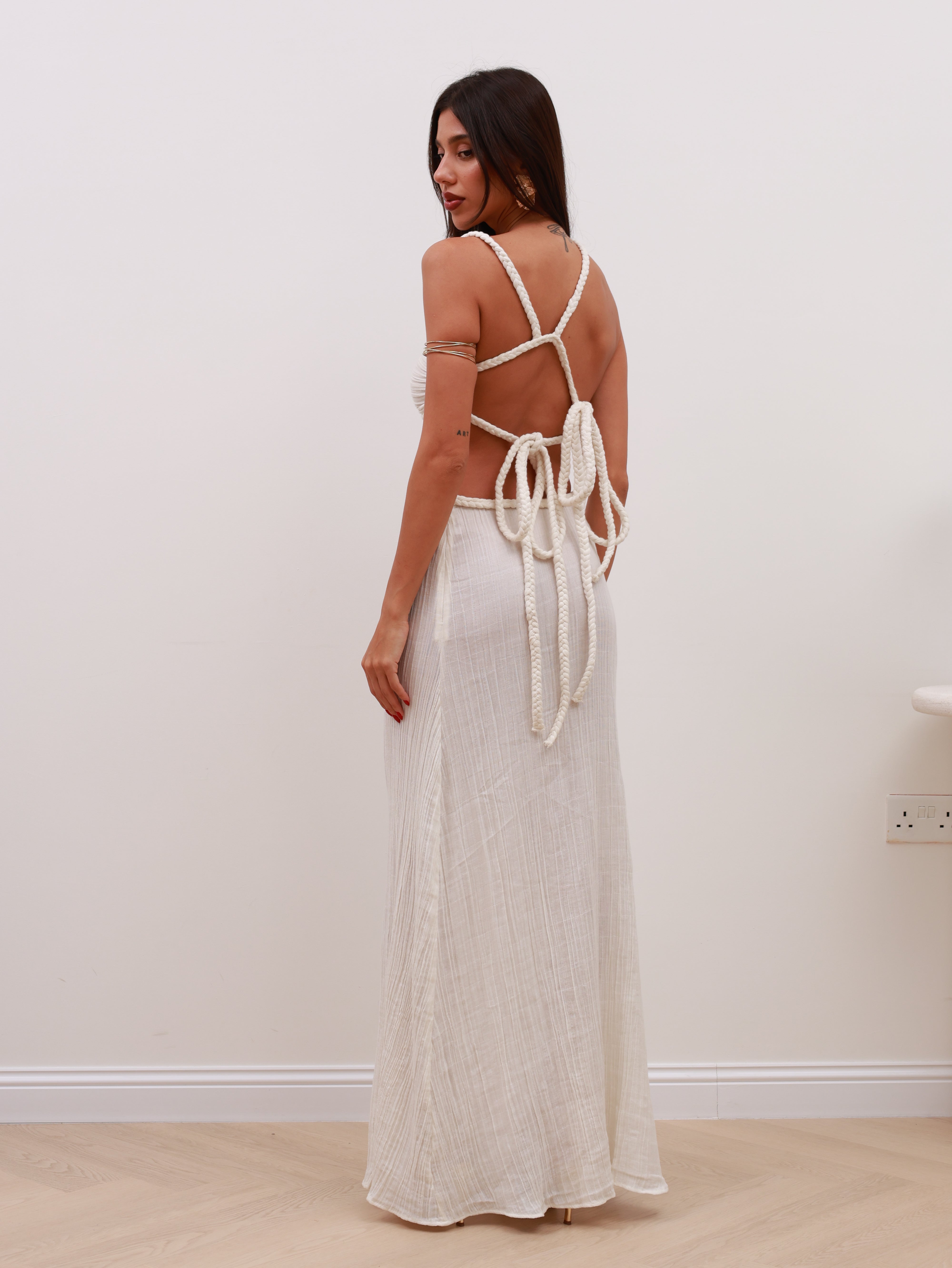 Elegant and effortless, this braided maxi dress is designed with a sleek open-back silhouette and a tie-back closure, adding adjustability and subtle detail. The braided accents bring texture and refinement, while the flowing cut creates a graceful, elongated profile.