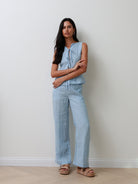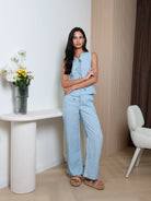 Crafted from 100% linen and fully lined with soft cotton mulmul, both pieces are breathable, lightweight, and comfortable against the skin. Cut in a Small (S) fit, the top measures 21” in length while the pants measure 42”, creating a fluid, elongated profile that transitions seamlessly from day to evening wear.