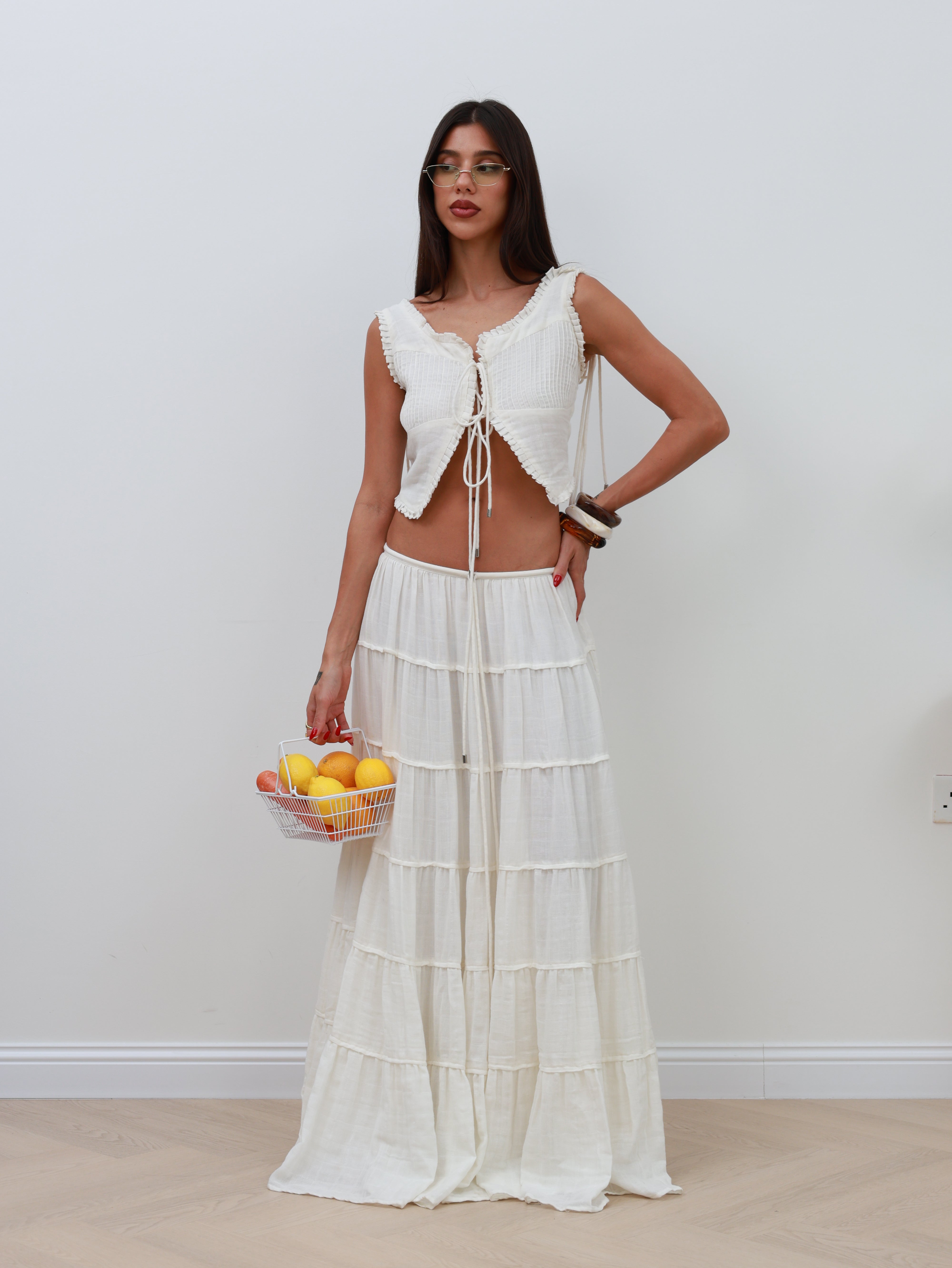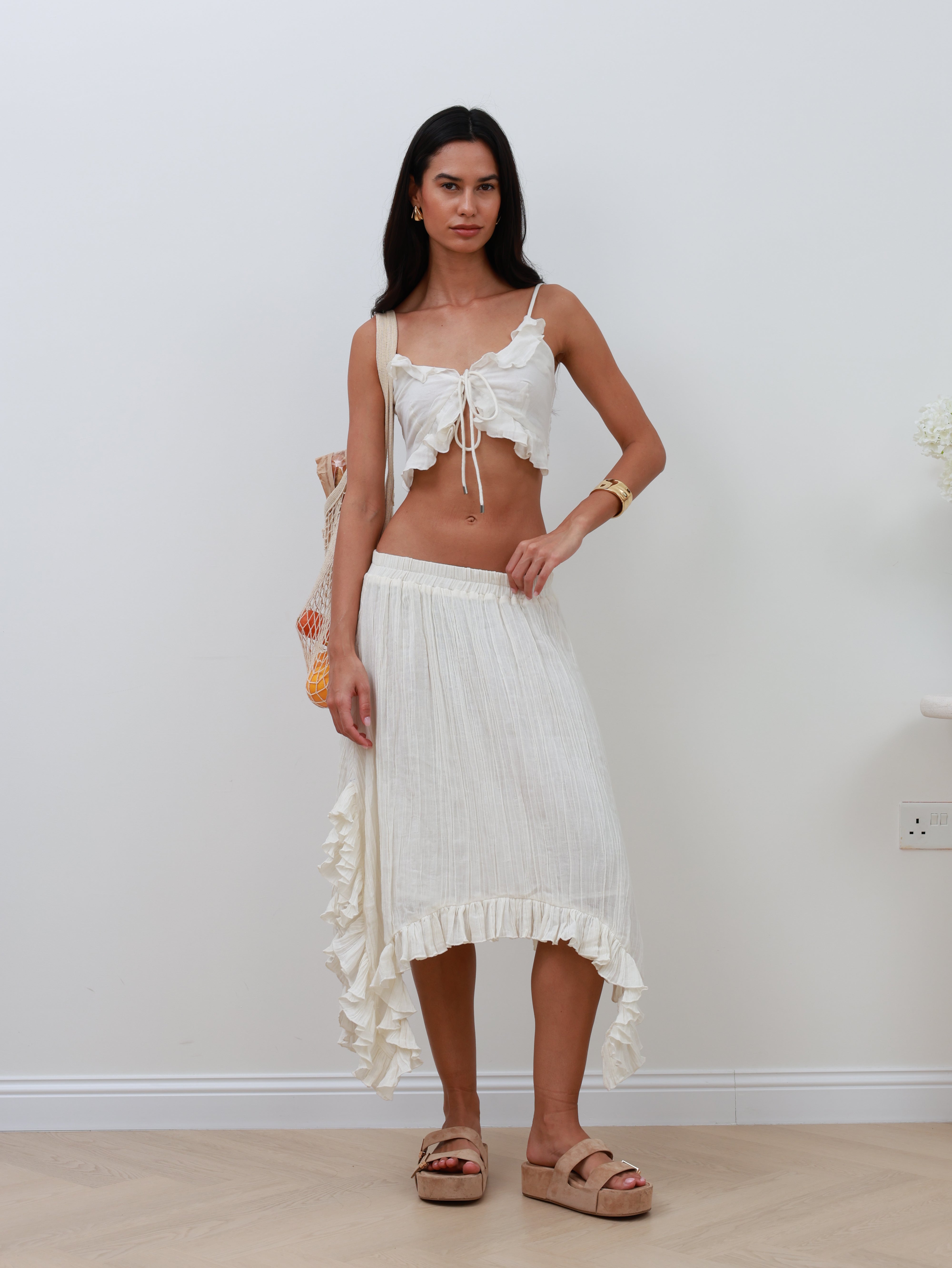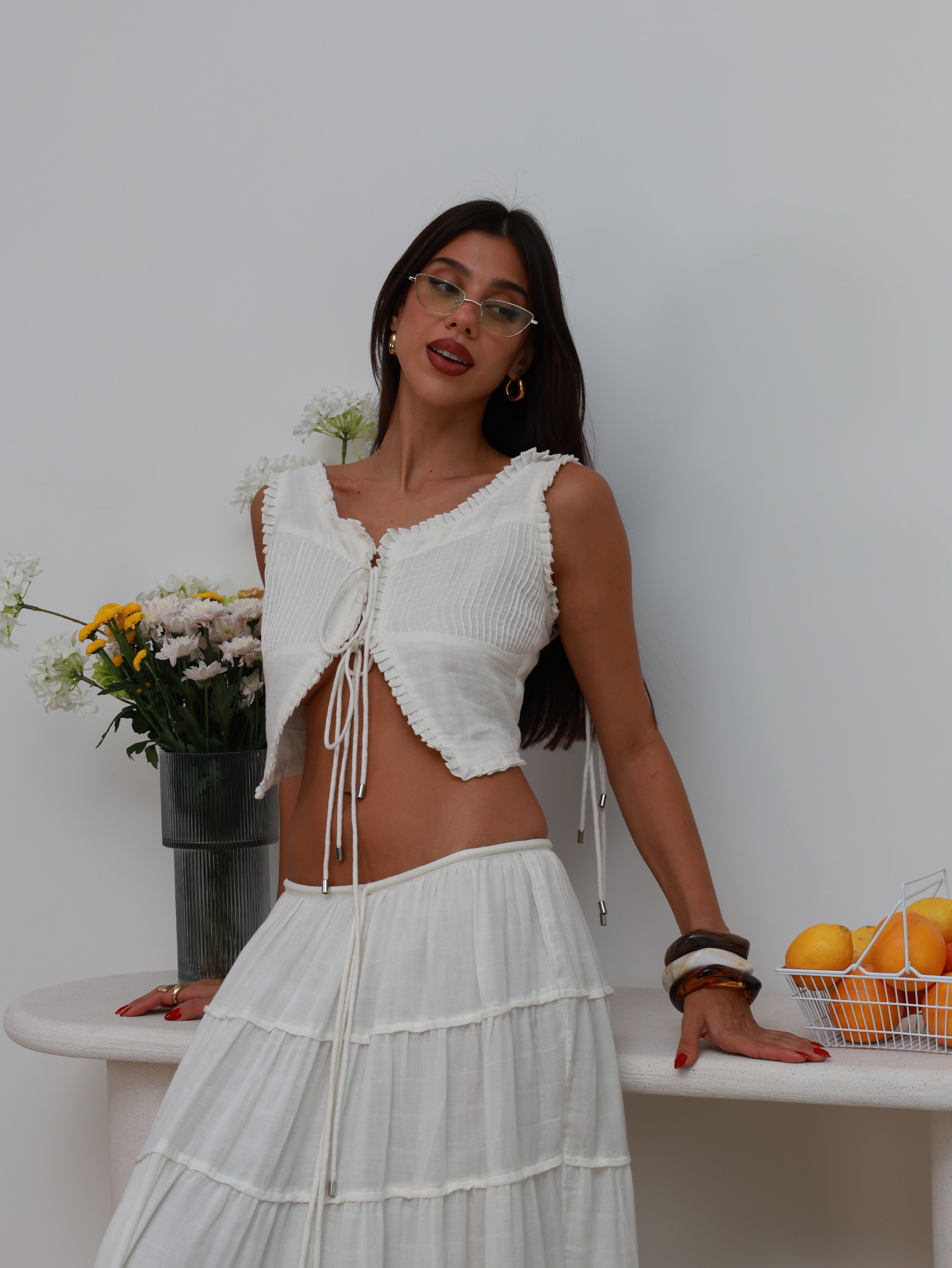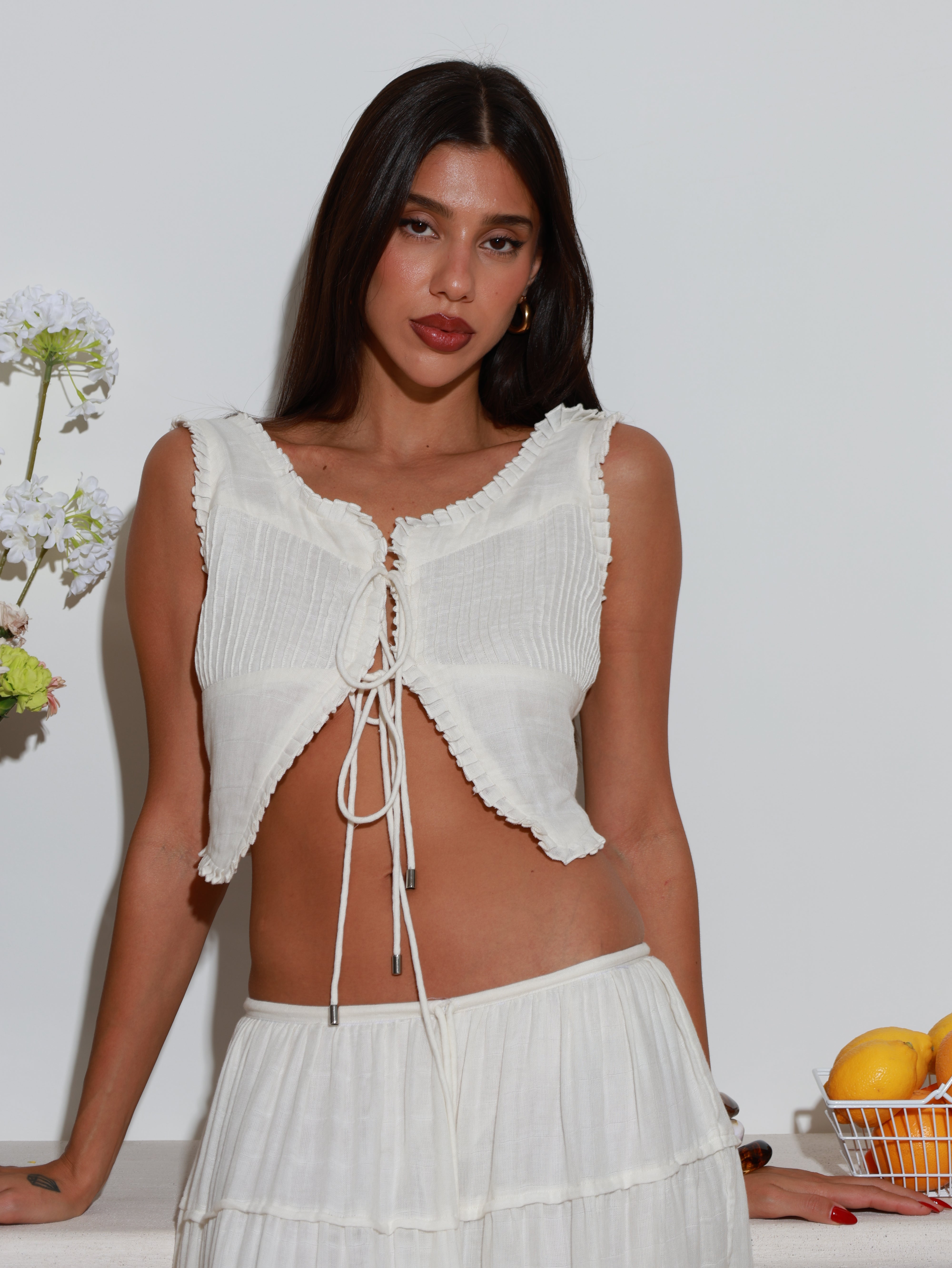 Elevate your everyday with this refined crop top, designed with meticulous pin-tuck detailing and a delicate frill border that adds a touch of feminine charm. The scoop neckline frames the collarbone elegantly, while adjustable drawstrings at both the front and back allow you to tailor the fit to your liking.