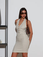 Modern and minimal, this co-ord set is tailored for effortless sophistication. The halter-neck vest features a button-front closure, an elegant backless design, and a waist tie at the back for a secure, customizable fit. Paired with an above-the-knee skirt detailed with a side-seam zipper, the set balances structure with ease, making it versatile for day-to-evening wear.
