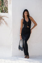 A stunning ensemble that exudes both elegance and comfort. This halter neck backless vest has wooden button closure, while the maxi skirt boasts a stylish slit at the back. Crafted with 100% linen, this set offers a breathable and luxurious feel. Perfect for any occasion, embrace timeless beauty with the Alaia set.