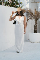 A stunning ensemble that exudes both elegance and comfort. This halter neck backless vest has wooden button closure, while the maxi skirt boasts a stylish slit at the back. Crafted with pure linen, this set offers a breathable and luxurious feel. Perfect for any occasion, embrace timeless beauty with the Alaia set.