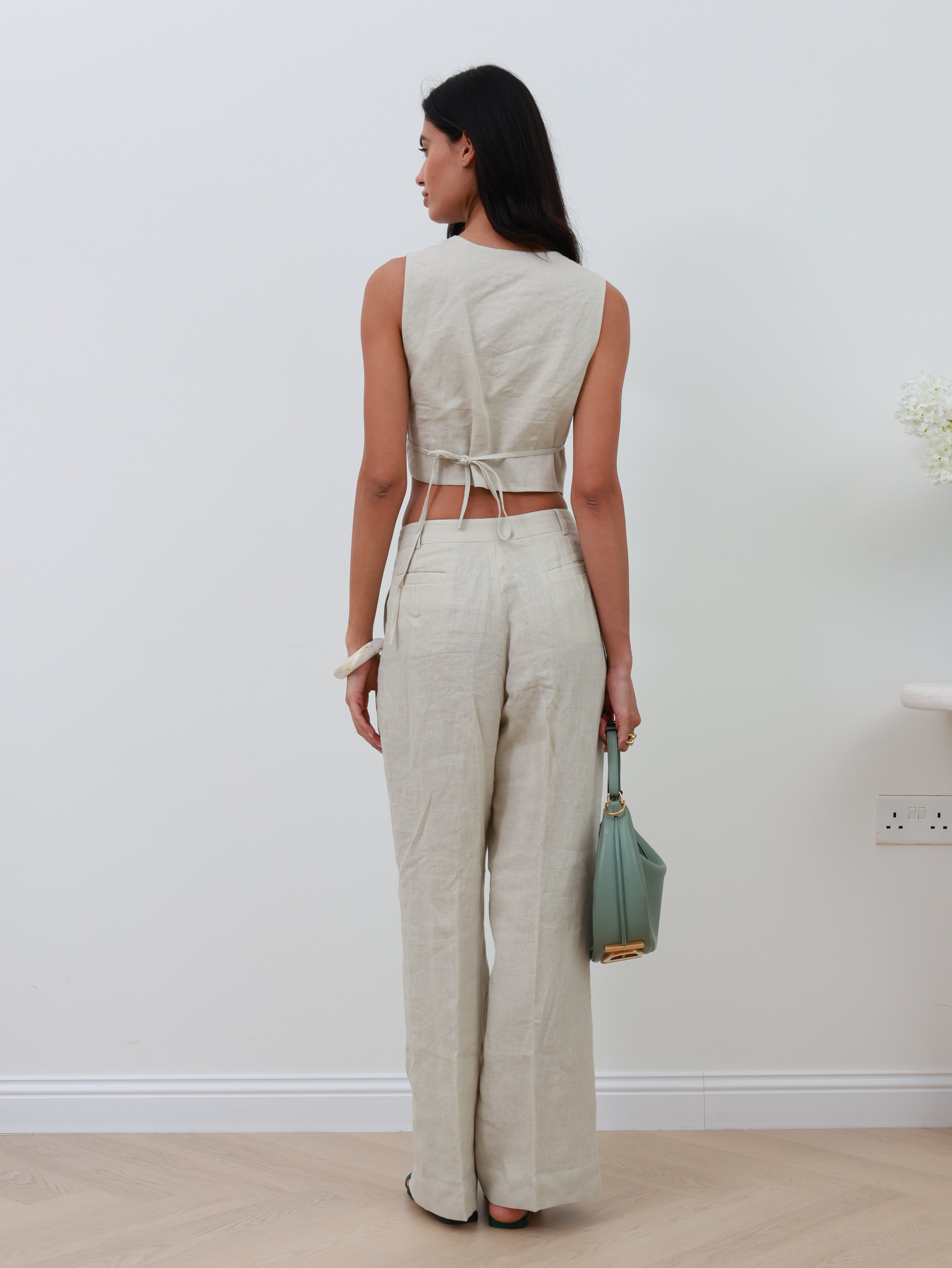 Crafted from 100% linen and fully lined in cotton mulmul, the pieces feel breathable, soft, and elevated—ideal for both warm-weather days and polished evenings. Designed in a Small (S) fit, the vest measures 21” while the pants measure 42”, creating an elongated and refined silhouette.