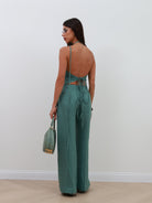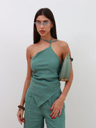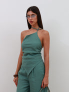 Minimal yet striking, this co-ord set pairs an asymmetrical top with a sleek wide-leg pant for a refined, contemporary silhouette. The top is designed with adjustable straps at the neck and waist, allowing for a customizable fit that flatters while maintaining ease. It is paired with wide pants featuring side and back pockets, belt loops, and a hook-and-eye with zipper closure, blending structure with functionality.